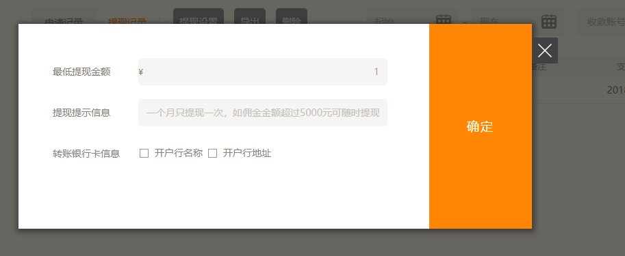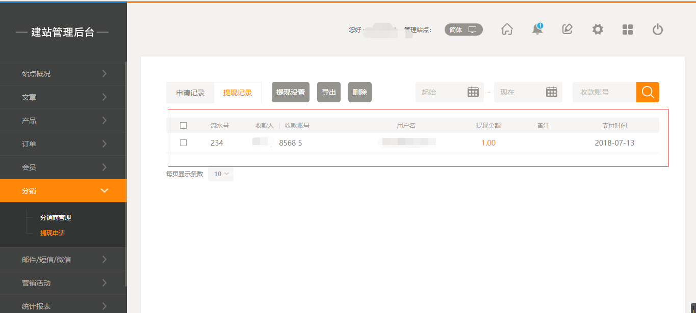 6.当用户在前台提交提现时,在后台的“提现申请”中可以看见该申请记录,如图所示: